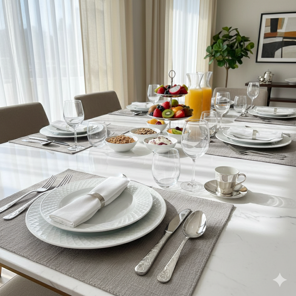 Éclat Lumineux : La finition argentée haute brillance capture la lumière et apporte une clarté immédiate à votre dressage, s'accordant harmonieusement avec toutes vos couleurs de vaisselle, du blanc pur aux teintes sombres.