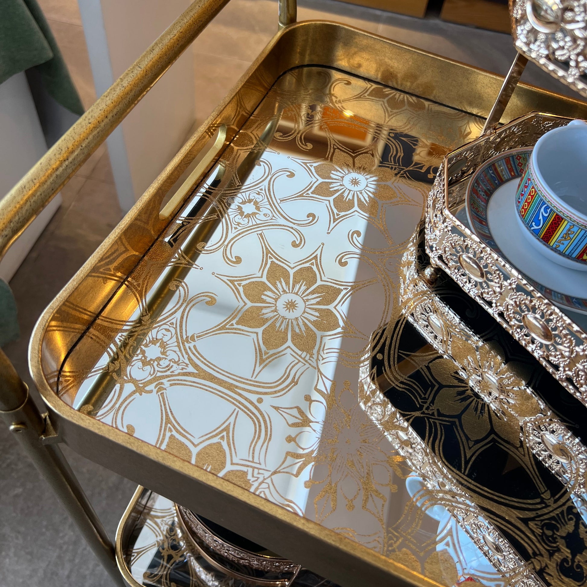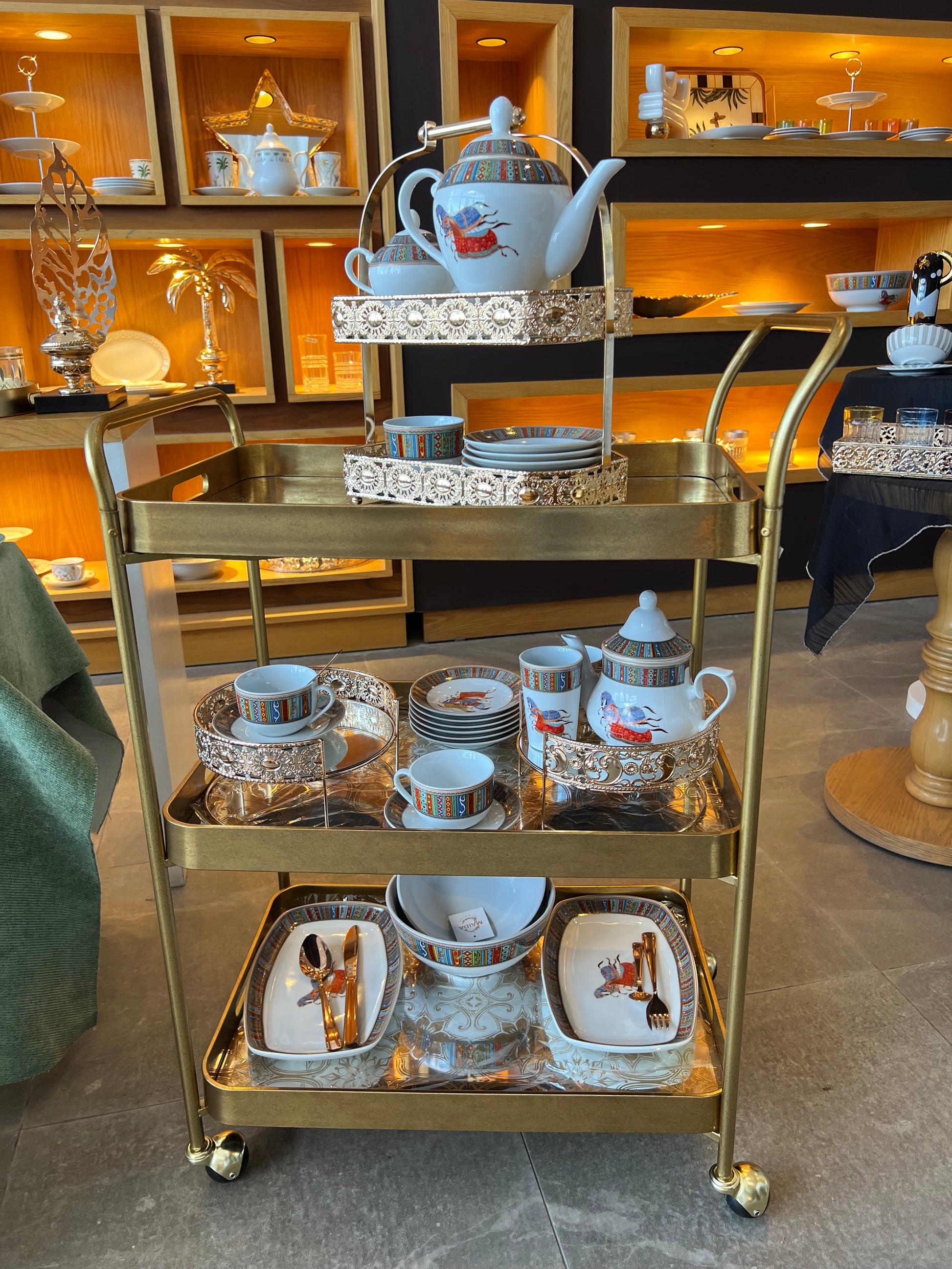 Un chariot 3 niveaux en métal doré, pratique et élégant. Démontable, facile à ranger, et chaque niveau devient un plateau de service. Chic, fonctionnel et parfait pour vos réceptions