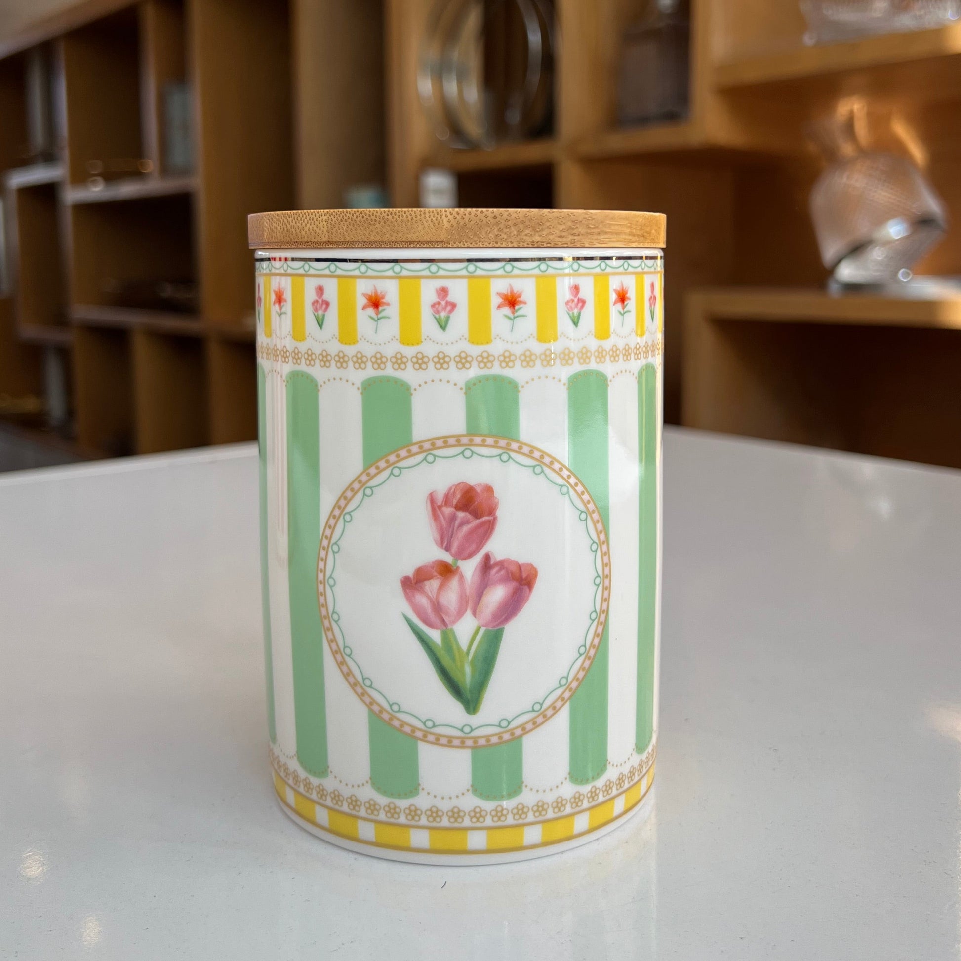 - Esthétique Florale : Chaque boîte est ornée des motifs signatures de la collection : de larges rayures verticales colorées surmontées d'une délicate guirlande de fleurs printanières. Le médaillon central met en scène l'hortensia rose emblématique.