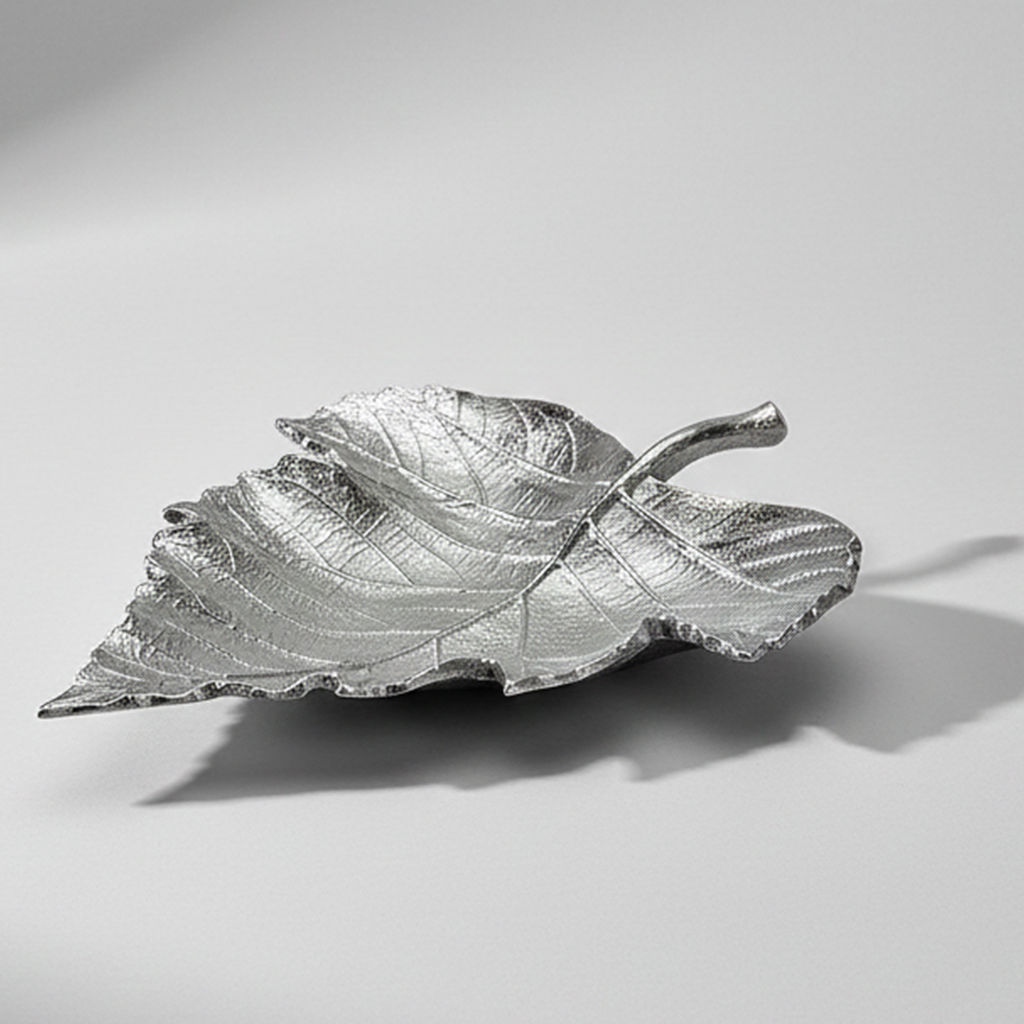 Adoptez la sophistication de la nature avec notre collection de plats décoratifs en forme de feuille. Moulés avec un réalisme saisissant, ces accessoires reflètent la lumière grâce à leur finition argentée brillante et leurs nervures détaillées.