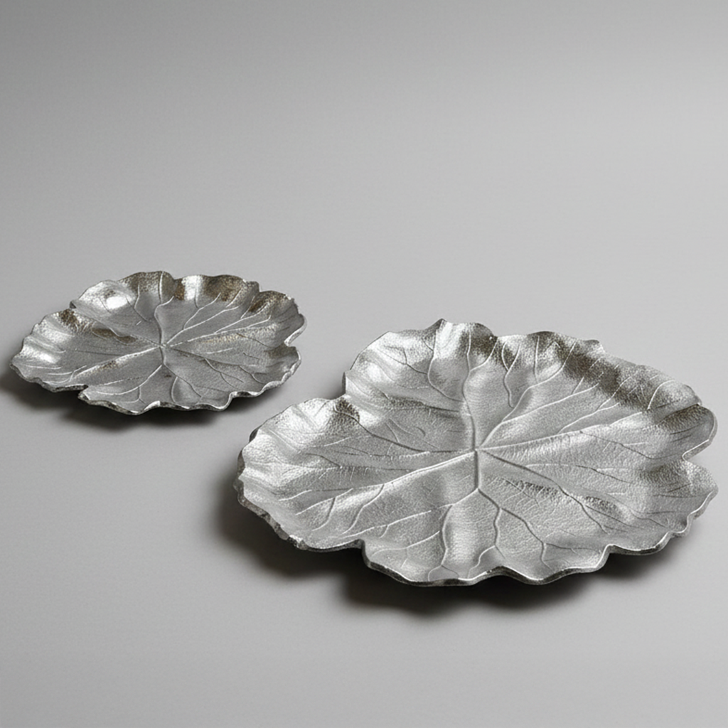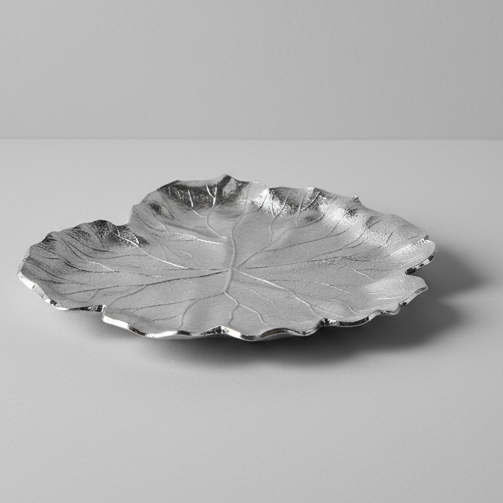 PLAT ROND DECORATIF FEUILLE ARGENTEE