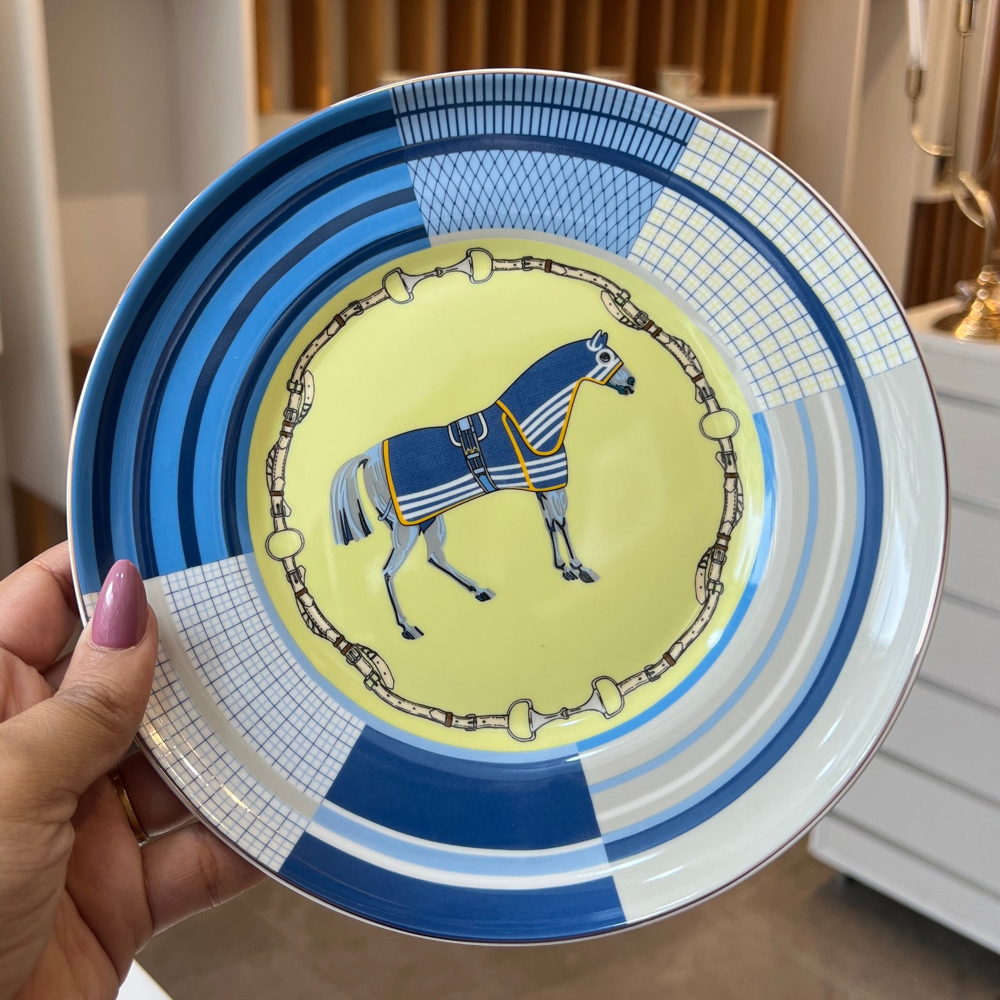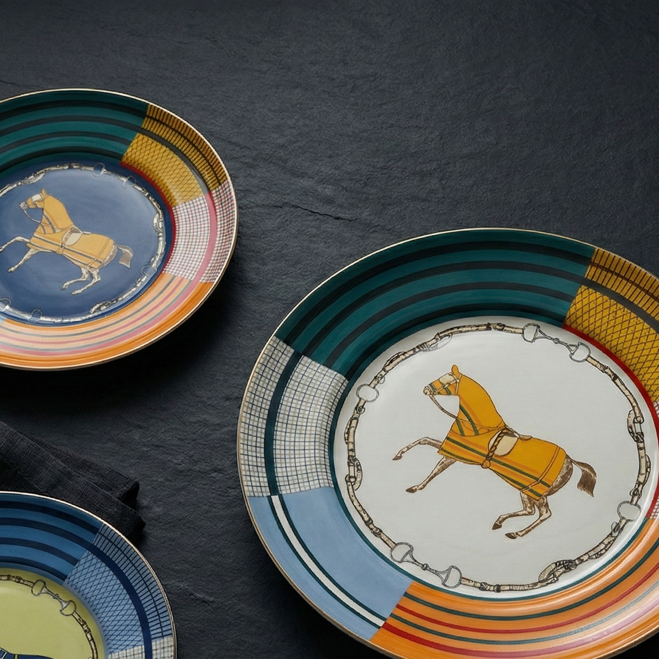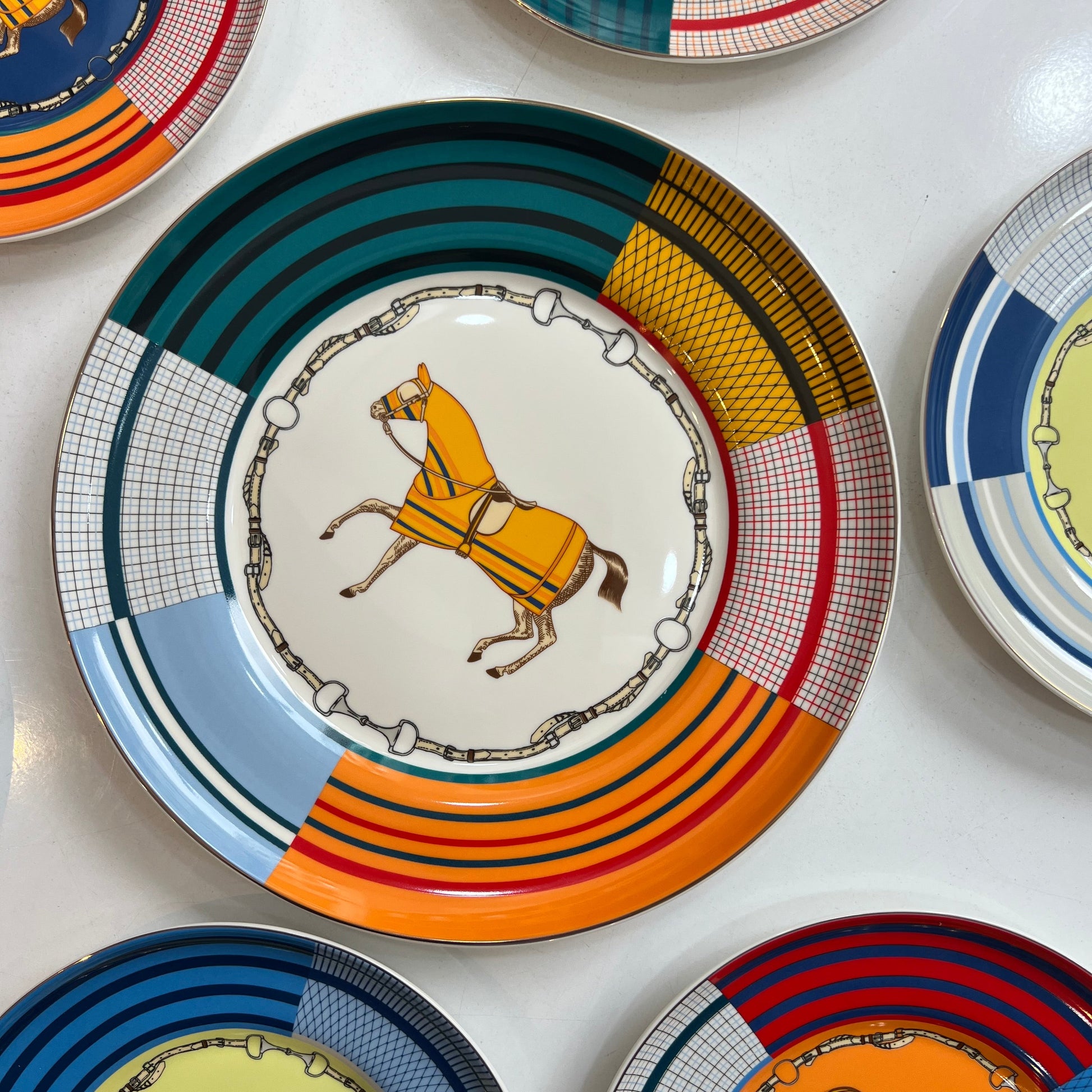 Plongez dans l'univers raffiné de la haute cavalerie avec ce service à gâteaux signature. Chaque assiette est une œuvre d'art, mêlant des motifs géométriques audacieux à l'élégance intemporelle des harnais et mors équestres. Un contraste vibrant de couleurs qui transformera vos fins de repas en un moment de pur prestige.