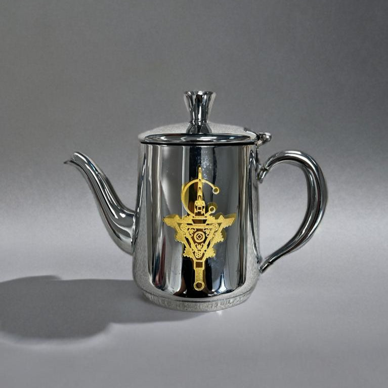 Sublimez votre service à thé avec cette théière en inox ornée d’une fibule dorée, symbole ancestral de protection et d’élégance.